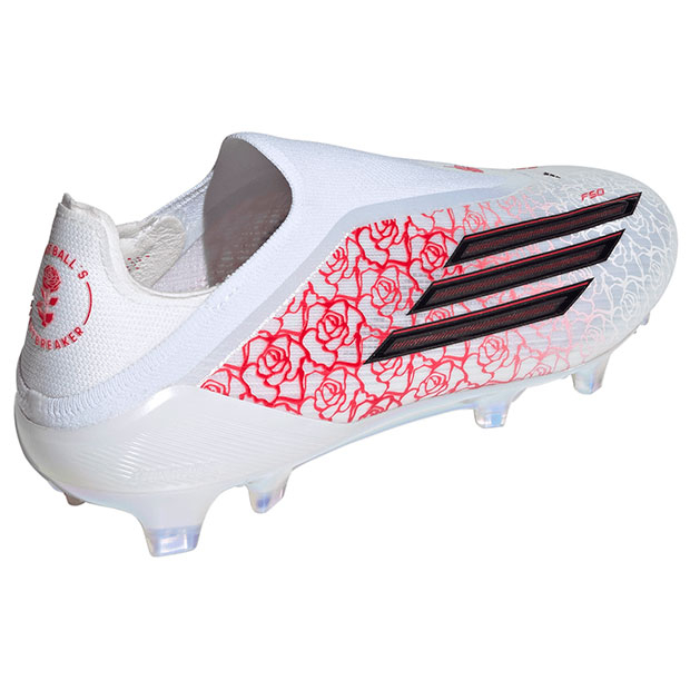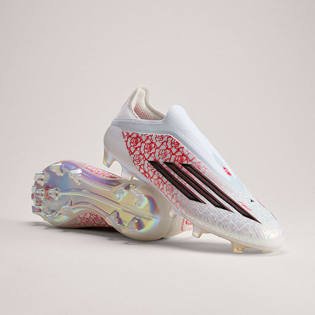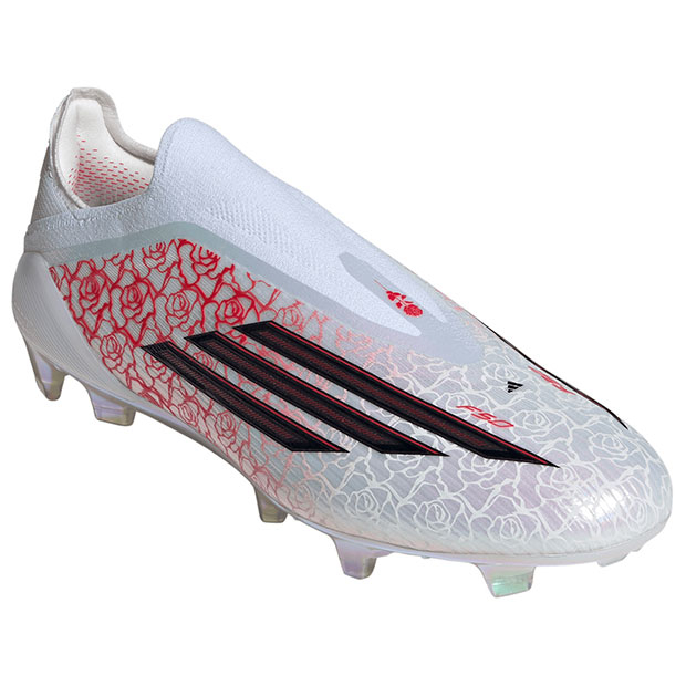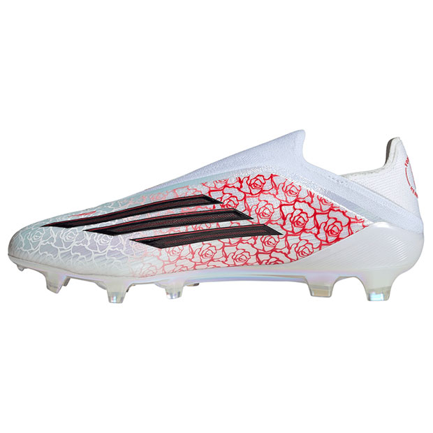 アディダスのアイコニックなスピードコンセプトモデル「F50」のサッカースパイク、レースレス仕様。薄いファイバータッチアッパーに、つま先にボールが吸い付くようなスプリントウェブと、足がブレないようにホールドするadidas PRIMEKNITの履き口を採用。バネのような弾力性を発揮するスプリントフレーム360アウトソールが、あらゆる方向への加速とスピードに貢献。天然芝グラウンド対応。